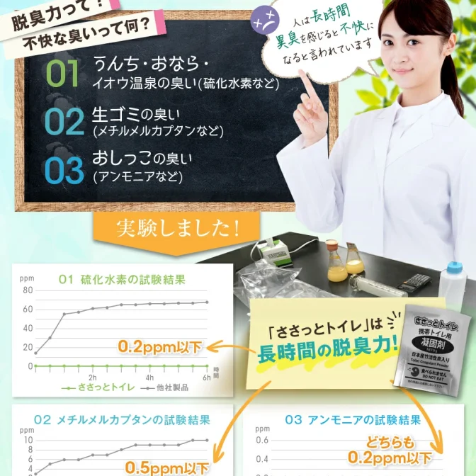 日本 国内製造の抗菌性凝固剤です。排泄物に含まれる菌の増加による嫌な匂いを抑制、さらに嘔吐物などの感染症の抑制に有効です。脱臭効果も高く、おしっこ(アンモニア)だけでなく、うんち(メチルメルカプタンや硫化水素)にも効果を発揮します。