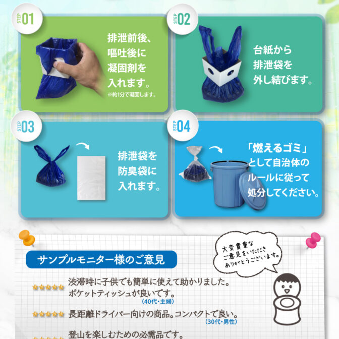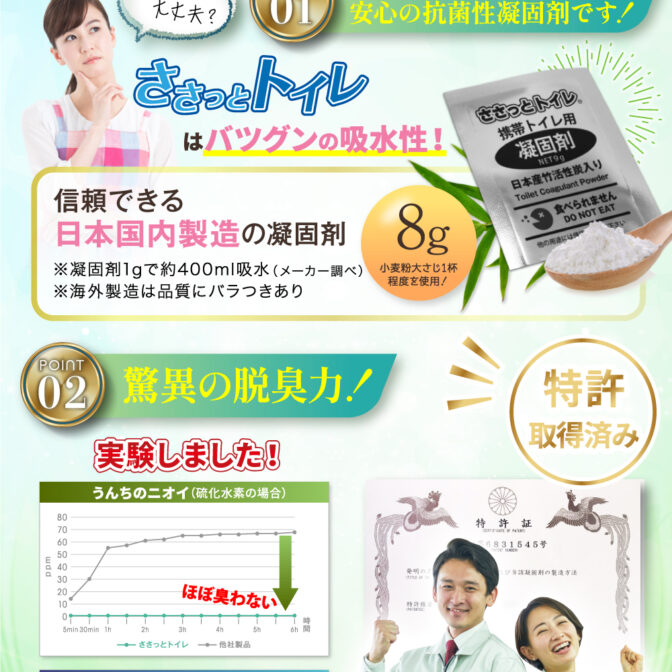 株式会社コゾノ企画は、日本国内製造の凝固剤メーカーです。特許取得済みの凝固剤で簡易トイレセットを取り扱っています。災害時は非常用トイレ、登山時は携帯トイレ、渋滞時のトイレや介護トイレに役立ちます。長期保存が可能で災害などの備蓄、防災グッズにおすすめです。私たちのが製品やサービスが少しでも自助・共助の力になれば幸いです。